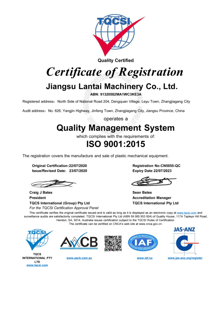 Jiangsu Lantai Machinery Co., Ltd is specialized in plastics machinery. Our company is located in Jinfeng Town, Zhangjiagang City, Jiangsu Province. It is nearby Shanghai and Nanjing, by the side of Yangtse River.